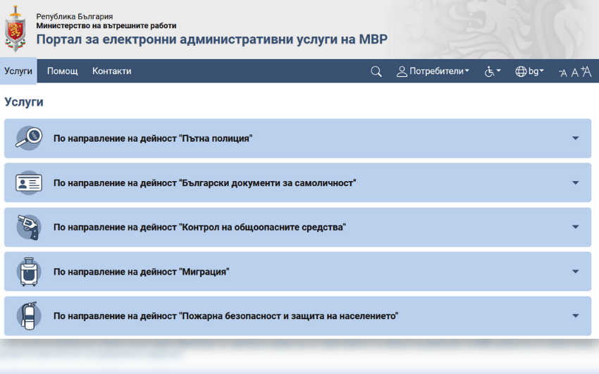 По електронен път гражданите и организациите могат да заявяват административни услуги, както досега, по направленията „Пътна полиция“, „Контрол на общоопасните средства“, „Частна охранителна дейност“, „Български документи за самоличност“, „Миграция“, „Пожарна безопасност и защита на населението“.