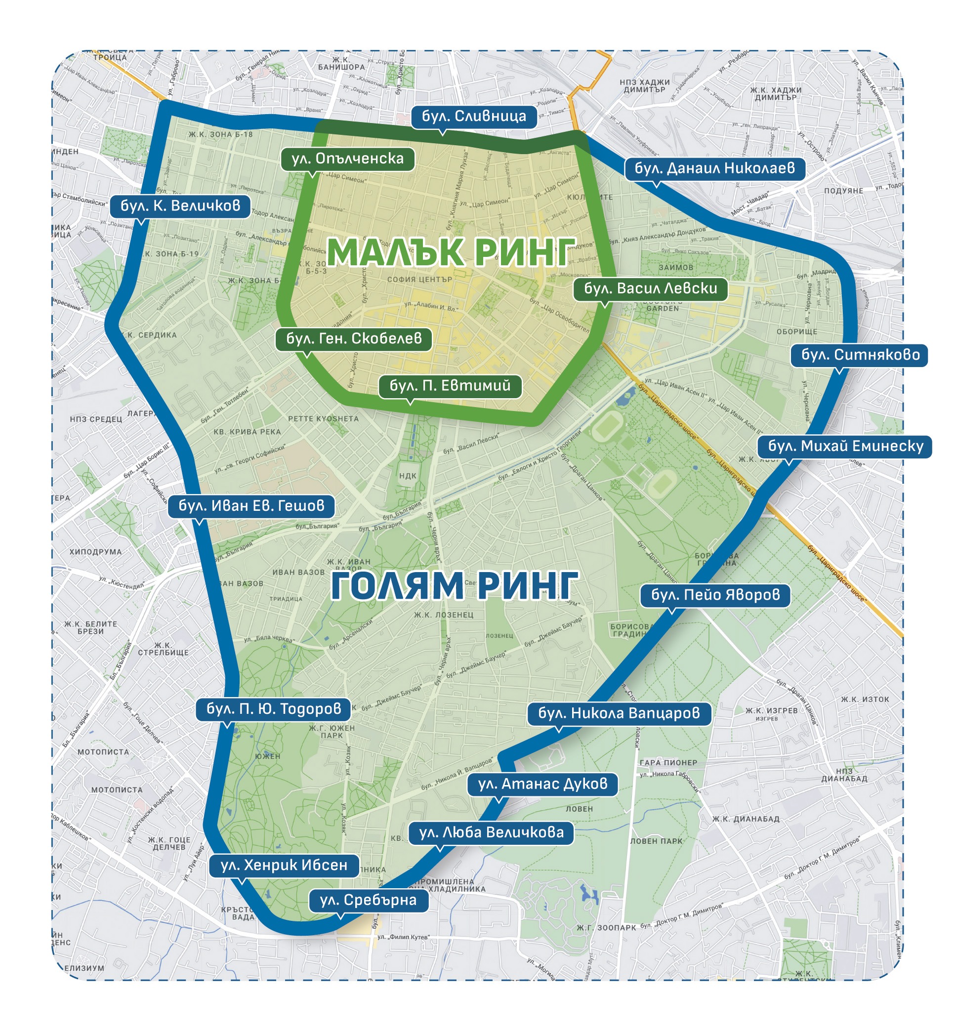 Големият ринг, в който е забранено навлизането само на най-замърсяващите автомобили от първа екогрупа, е „заключен между%: бул. „Сливница“; бул. „Данаил Николаев“ ; бул. „Ситняково“; бул. „Михай Еминеску“; бул. „Пейо Яворов“; бул. „Никола Вапцаров“; ул. „Атанас Дуков“; ул. „Люба Величкова“ ул. ; „Сребърна“; ул. „Хенрик Ибсен“; бул. „П. Ю. Тодоров“; бул. „Иван Ев. Гешов“; бул. „К. Величков“.