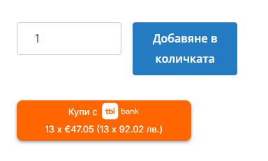 За артикулите които могат да се възползват от тази опция, под бутона „Добавяне в количката“ излиза бутона за TBI bank.